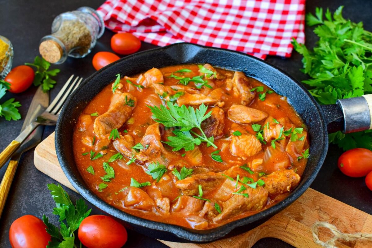 Куриная грудка, тушенная с овощами в томатном соусе (в сковороде)