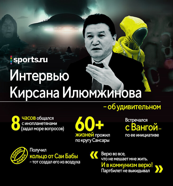 Поговорить про политику и отдельные детали биографии с ним было бы крайне интересно, но откровенная беседа по острым вопросам сейчас едва ли возможна. Зато есть тема, в которой из всего спортивно-политического мира Кирсану не будет равных – мистика и чудеса. Тем более он известен своими рассказами про это – в том числе про встречу с инопланетянами.