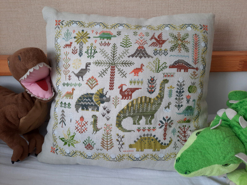 Многие дети в какой-то момент загораются темой динозавров и моя дочка не стала исключением. Хотя начала она с драконов, пересмотрела о них много мультфильмов (вот тут подборка, которую я составляла по ее предпочтениям), а потом перешла к динозаврам. Были куплены два игрушечных динозавра в ИКЕЕ, которым были даны имена - Злыдень и Капусточка. Велоцераптор Злыдень вообще стал ее любимой игрушкой. И я решила добавить в динозавровую тему подушку с вышивкой. Купила на сайте известного многим "Совиного леса" такой набор: Внутри симпатичной коробочки были ткань, нитки, схема, иголка и магнитик с динозавром. Очень мило! Вышивать было интересно и приятно. Все динозавры разные, растения вокруг них тоже. Нитки меланжевые с переходом оттенков. Например, начинаешь с сочно-зеленого, а заканчиваешь почти коричневым. Из-за этого получается интересный эффект. Злыдень с Капусточкой оценили и нашли себя! Велоцераптор и стегозавр одобряют. Заготовку для задней части подушки с вшитой молнией я купила в маг