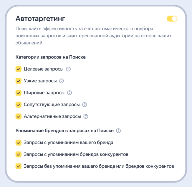 - Автотаргетинг станет обязательной настройкой для всех новых кампаний. Потребуется выбрать хотя бы одну категорию автоматически подбираемых запросов.
