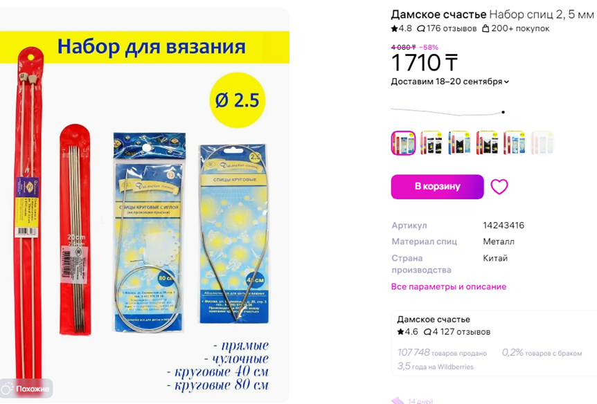 Всем доброго дня! Если меня читают начинающие вязальщицы, то эта информация, возможно, вас заинтересует. Всегда возникает вопрос, что нужно купить в начале своей творческой деятельности. Хочется купить все и сразу. И много красивой пряжи, и самые крутые инструменты. Но, к сожалению, не всегда бюджет позволяет это сделать. На днях зашла на валберис и нашла комплекты спиц, по очень доступной цене. Самое главное, их подбор. В комплект входят длинные парные спицы, чулочные спицы, круговые короткие спицы и круговые длинные спицы. Имея такой нехитрый комплект можно связать все! И плечевое изделие, и носки, и шапки, все что только захочется. И комплекты эти подобраны под разные размеры. Можно взять самый ходовой или любимый размер и начать учиться вязать, или пополнить свои инструменты. Это бюджетный вариант, когда вы еще не знаете будете ли вы вязать, понравится ли вам этот вид рукоделия, то можно начать с простых инструментов. Ну, а если позволяют финансы, то и с дорогих инструментов конечн