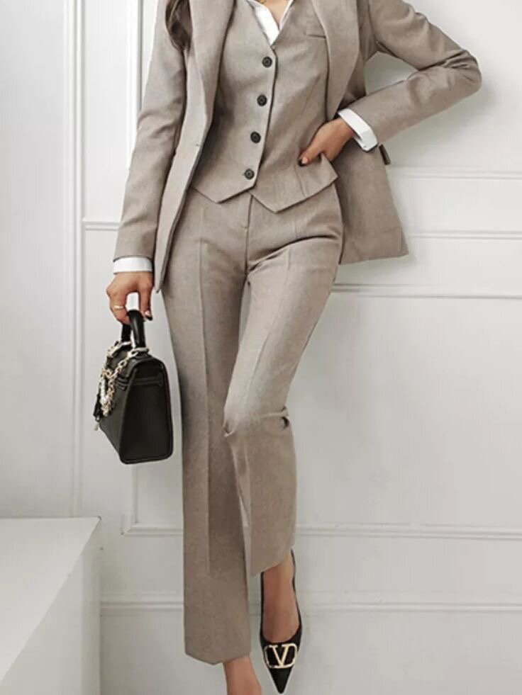 Классический женский костюм - это стильный и элегантный выбор для различных профессиональных и формальных событий. Вот ключевые характеристики классического женского костюма: 1. Цвет обычно выбирают темные или нейтральные цвета, такие как черный, серый, темно-синий, коричневый или бежевый. Эти цвета подходят для разных событий и создают универсальный вид. 2. **Фасон пиджака:** Классический пиджак чаще всего имеет прямой крой с умеренными плечами и одну или две пуговицы спереди. Он должен сидеть хорошо по фигуре. 3. **Брюки или юбка:** Брюки могут быть суженными к низу или иметь прямой крой, в то время как юбка может быть прямой или с разрезом сзади для комфорта при ходьбе. 4. **Материал:** Высококачественные ткани, такие как шерсть, шерсть с добавлением синтетических волокон или хлопок, обеспечивают профессиональный вид и комфорт. 5. **Рубашка:** Под костюмом можно носить белую или светлую рубашку с классическим воротником или блузку. 6. **Аксессуары:** Добавьте пояс, формальную