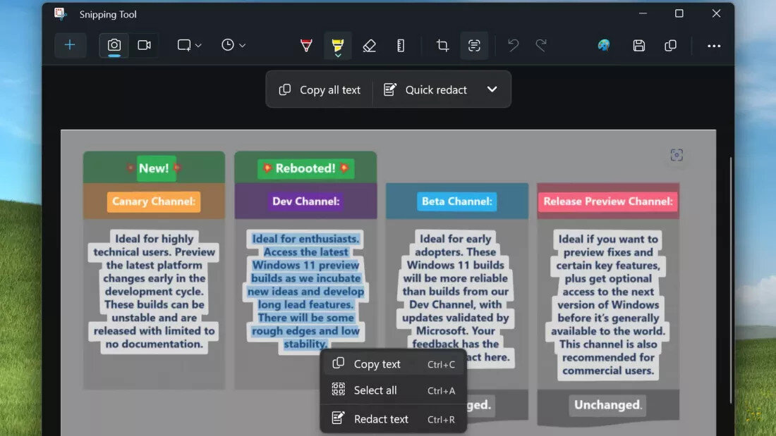Прямо сейчас Microsoft обновляет приложения Phone Link и Ножницы, новые версии доступны тем, кто пользуется бета-версией Windows. Возможность копирования текста с картинки появляется в приложении Ножницы, которое сейчас используется для создания и редактирования скриншотов. Аналогичная возможность есть в утилите Microsoft Power Toys, которая, однако, не входит в состав операционной системы, но распространяется бесплатно отдельно. Microsoft сообщает, что теперь приложение Ножницы будет определять наличие текста на всех скриншотах и давать возможность распознать его по нажатию кнопки на тулбаре. В случае, если блоков текста несколько, можно будет выделить именно тот, который вас интересует. Такие новости мы постоянно публикуем в Telegram. Подписывайтесь на канал, чтобы ничего не пропустить ;) Кроме того, дадут возможность редактировать текст на скриншотах. Это окажется полезно, чтобы скрыть email, номера телефонов или что-либло ещё перед тем, как поделиться скриншотом с другими. Сейчас э