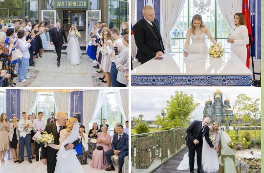 Музейно-храмовый комплекс ВС РФ Минобороны России подвел итоги года работы Зала торжеств. Здесь проходят выездные регистрации брака, организованные совместно с Московским областным Дворцом бракосочетания №3 Главного управления ЗАГС Московской области. За это время 88 военнослужащих создали здесь свои семьи. Всего же за время своей работы Зал торжеств провел 179 церемоний бракосочетания. Открытая год назад площадка пользуется популярностью из-за своей уникальности и духовной составляющей. Для молодоженов здесь есть все, что необходимо для главной семейной церемонии: живой звук, торжественная обстановка зала, наполненного светом, «Мостик счастья», где можно закрыть символический замочек на счастье и незабываемый вид на Главный храм Вооруженных Сил Российской Федерации. Молодожены Никита и Екатерина рассказали, как они приняли решение выбрать именно это место для церемонии бракосочетания. «Два месяца назад здесь расписывались наши друзья. Нам очень понравилось, и мы решили тоже провести