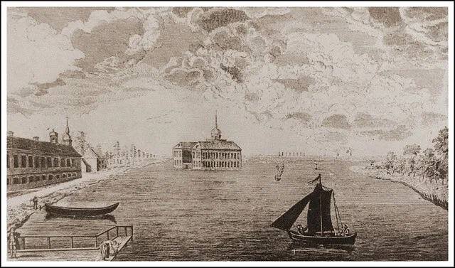 Деревянный Подзорный дворец в голландском стиле с балюстрадой был возведен весной 1706 года для Петра I на взморье между устьем Невы и Фонтанки и истоком Екатерингофки. В 1722 году начинается возведение дворца в камне по проекту Стефана ван Звиттена, которая продолжалась до 1731 года (завершением возведения и отделкой с 1728 по 1731 год руководил М. Г. Земцов, внесший некоторые изменения в первоначальный проект). Дворец занимал практически весь остров, ступени крыльца вели прямо в залив, на залив выходили также окна императорской опочивальни.