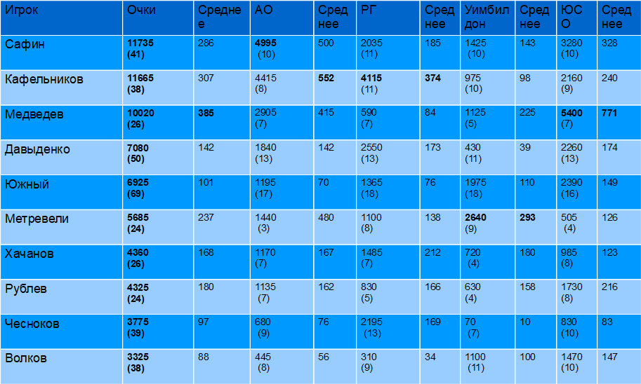 Набранные очки на Шлемах за карьеру у лидеров российского тенниса.