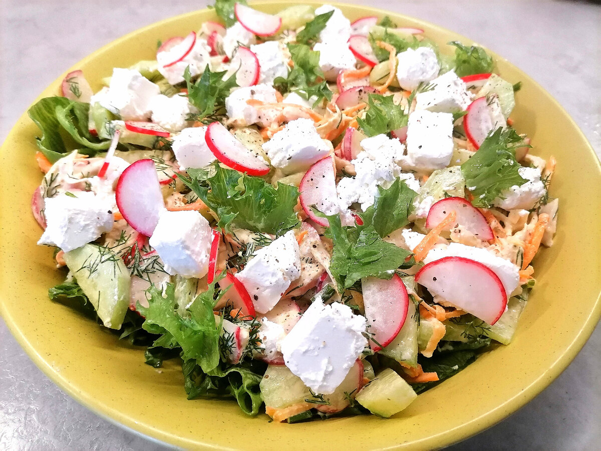 Легкий, свежий, хрустящий салат. Попробуйте! Ингредиенты: Курицу разобрать на волокна, остальные овощи нарезать произвольно. Заправить майонезом. Фету нарезать кубиком и выложить сверху салата. Салат очень хрустящий и свежий. Вкусный! Попробуйте приготовить. Жду ваши комментарии. Подписывайтесь на мой канал, будет вкусно 😉!