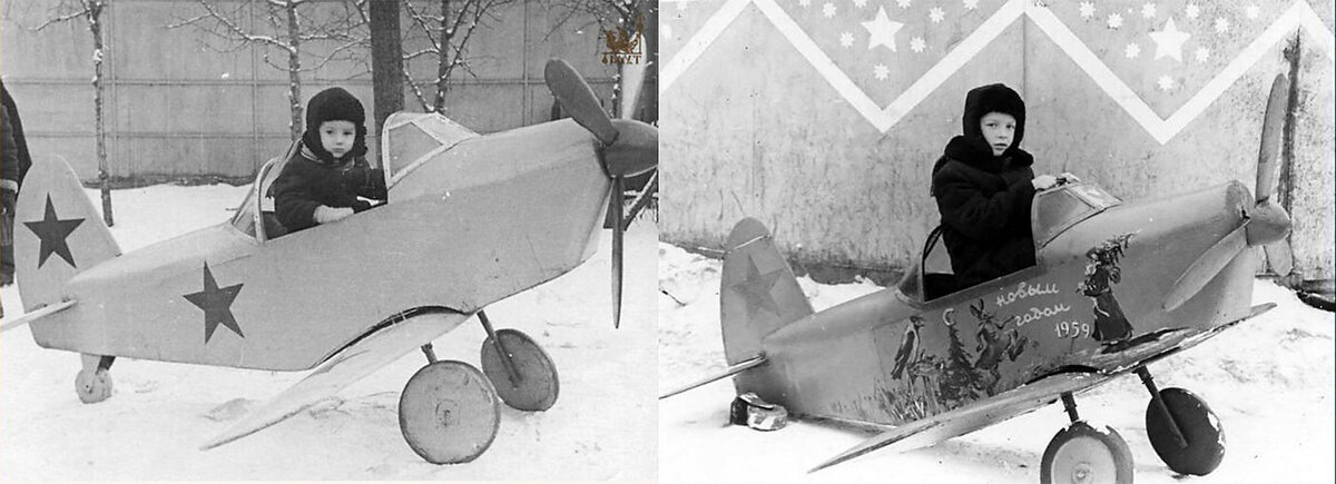 В прошлый раз я показал вам больше сорока фотографий детских вертолётиков для фотографирования, которые в советское время предлагались отдыхающим на главных детских курортах СССР. Но вертолётами дело, разумеется, не ограничивалось. Сегодня посмотрим самолёты и космические ракеты. Мода на фотографирование детей в игрушечных самолётах-колясках пришла, как и почти всё остальное, с запада. Вот одно из довоенных польских фото на эту тему: А вот тоже польское, но послевоенное: А это советское фото. Где и когда сделано — неизвестно. Первый курортный «фотосамолётик» появился, видимо, в конце 1950-х годов в Евпатории. Это был поршневой двухмоторный самолёт без окон. В начале 1960-х его сменил самолёт нового поколения — реактивный, сделанный явно по мотивам Ту-104. Позже там был и красивый реактивный истребитель с настоящим штурвалом от Ил-18. А также две космические ракеты: «Марс-1» и «Юпитер». А в Керчи был свой то ли самолёт, то ли ракета «Земля-Луна». В 1979 году его зачем-то переименовали в