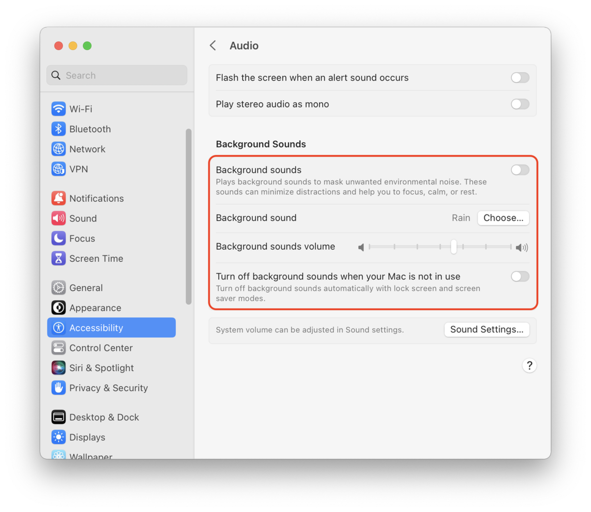 Любите работать под звук дождя? Я да. Он расслабляет и способствует концентрации. В macOS есть набор фоновых звуков, которые помогут абстрагироваться от обстановки вокруг. Помимо дождя еще есть очень крутой звук Dark Noise – низкочастотный шум, похожий на звук мощной вытяжки. Он как будто переносит тебя в пустой офис – самое то для работы. Включить эти звуки можно в настройках: System Settings (Системные настройки) → Accesibility (Универсальный доступ) → Audio (Аудио) в разделе Hearing (Слух) → галочкаBackground sounds (Фоновые звуки) Для удобства включения можно вынести эту настройку на строку меню. В настройках зайдите в Control Center (Пункт управления) и у Hearing (Слух) поставьте галочку у Show in Menu Bar (Показывать в строке меню). _