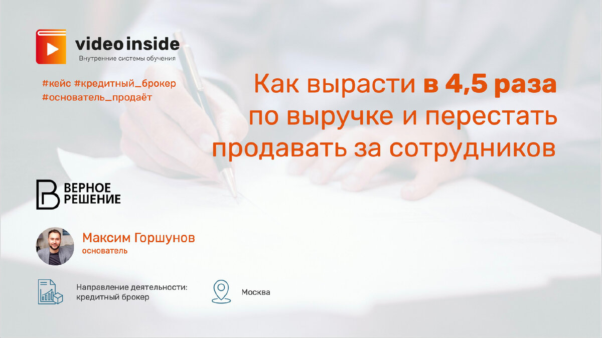 💼Сегодня мы знакомим вас с нашим первым героем — Максимом Горшуновым, основателем компании «Верное решение». 🔥Это история о том, как вырасти в 4,5 раза по выручке и перестать продавать за сотрудников. Направление деятельности компании — кредитное брокерство. Компания Максима помогает людям со сложной кредитной историей получить банковские кредиты и ипотеку. На старте ситуация была такая: ❌ Выручка 800 000 рублей в месяц, объем выдачи кредитов 8 000 000 рублей (в целом, даже есть прибыль, но на Турцию по горящей путевке все еще не хватает) ❌ Два менеджера и основатель продает за них и отвечает на кучу вопросов: от «Как отработать возражение “дорого”?» до «Как пользоваться принтером?» (Знакомо до боли, не правда ли?) После создания системы обучения: ✅ Выручка компании составила 3 600 000 рублей, объем выдачи 36 000 000 рублей ✅ Наняли 4-х новых менеджеров и описали разделение функций «Хантера» (ведение сделки от лида до договора) и «Фермера» (от договора до выдачи) ✅ Основатель полност