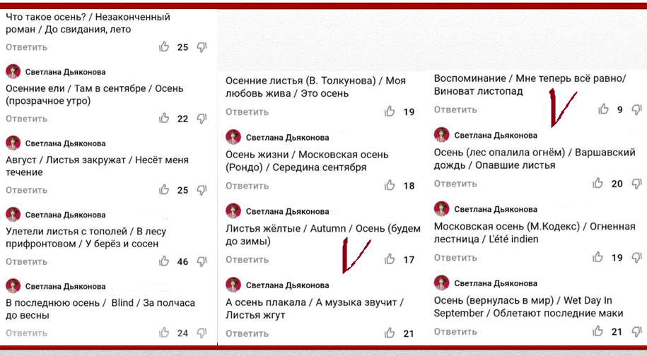 Надежда Дементьева: "Листья жёлтые". Композитор Раймонд Паулс, поэт Янис Петерс. Русский текст песни - Игорь Шаферан. Песня была написана в 1968 году на латышском языке и первыми ее исполнителями были Маргарита Вилцане и Ойяр Гринбергс, и называлась она "Последний лист".