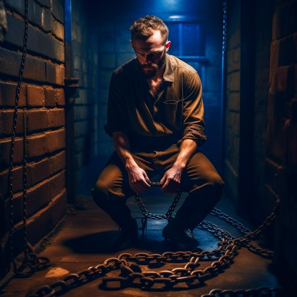 В сыром темном подвале, Джек был прикован к стене старинной цепью. Его руки и ноги были жестко скованы, а металлические звенья глубоко впивались в его плоть. Свинцовая тишина окутывала пространство, разрывалась только нависающей тьмой.
