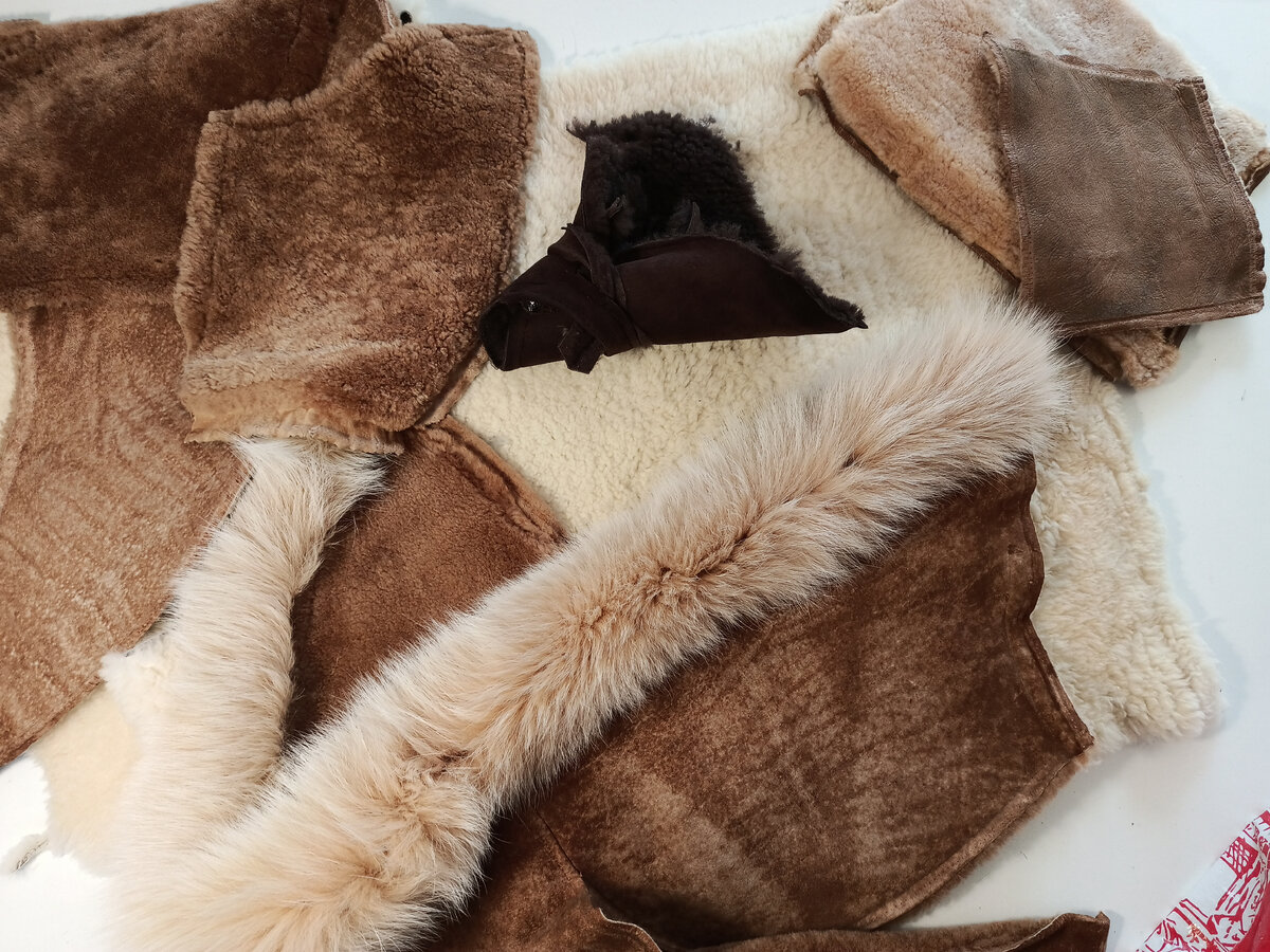 Начала новый проект, на мой взгляд, очень интересный. Мне принесли рыжую дублёнку и белый жилет из овчины. "А что же можно из этого сделать? " -спросили меня. Эх, держите меня семеро, с моими фантазиями! 🤯🤩🤪 Решили, что будем делать шубку. Овчина нынче в моде, а изделие мы точно сделаем красивым, скромно,я знаю😋. Поскребли по сусекам, добавили ещё кусок шоколадной шкурки и детскую дублёночку, которая идеально подошла к меху на капюшоне. Так все удачненько! Вот такой набор у нас получился. Очень долго вели переговоры выбирая фасон, думали. Вдохновение нашли здесь. Теперь дело за мной. Делаю лекало, разбиваю по цветам, разрезаю и начинаю крой. Выкроив ахуллиард деталей,снова склеиваю лекала. И теперь начинаю собирать детали кроя. Сначала собираю те детали которые не смогла выкроить целиком. Затем вручную соединяю все детали, мне так удобнее. А потом ,на скорняжной машине ,всё сразу сшиваю. Вот так это выглядит. Далее швы надо разгладить, деталь выровнять. Этот этап ещё