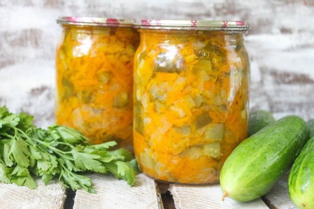 Для приготовления понадобится: 1,5кг. свежих огурцов., 0,5кг. моркови и лука., 250гр. перловки или риса., 300гр. томатной пасты., 100гр. сахара., 125мл. растительного масла., 50мл. 9% уксуса., 2 столовые ложки соли. Приготовление: Нарежем свежие огурчики и уложим их в кастрюлю. Добавим натёртую морковь, полукольцами лук, и перемешаем. Отварим практически до готовности перловку или рис (что вы больше предпочитаете). Соединим воедино томатную пасту, растительное масло, соль, сахар, зальём этой массой овощи, перемешаем и потушим вместе в течение получаса, помешивая. Добавим перловку или рис, потушим 5 минут, добавим уксус, перемешаем и разложим по стерилизованным баночкам. Закатаем, укутаем, дадим остыть. Приятного аппетита!