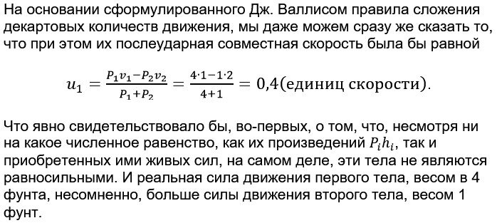 То, после их объединения в единое тело, они не остановили бы друг друга, несмотря ни на какое равенство приобретенных ими живых сил, а продолжили бы их совместное движение в ту же самую сторону, в которую до их столкновения двигалось тело весом в 4 фунта.