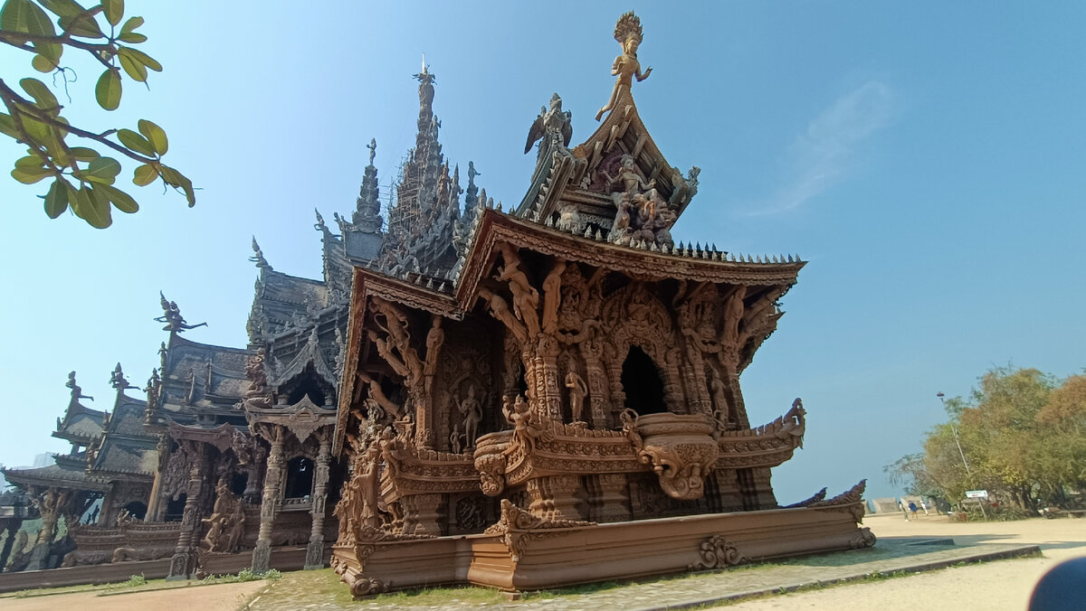 Храм Истины- один из самых красивых и впечатляющих храмов Таиланда, возвышающийся на высоту более ста метров , построенный из ценных пород древесины без единого гвоздя (возможно строят и без гвоздей, но честно сказать, на некоторых фрагментах гвозди видели). Расположен на берегу Сиамского залива в районе Наклуа ( северный район Паттайи ). Каждый квадратный сантиметр храма — это деревянные резные скульптуры и орнаменты на религиозные и мифологические сюжеты. В храм мы решили съездить самостоятельно. С района Джомтьен в 1(.) сели на тук - тук и доехали до ценра города 2(.), затем пройдя перекресток -едем на другой маршрутке до фонтана с дельфинами 3(.). Если водитель тук- тук не высаживает пассажиров на центральном перекрестке, значит смело едьте дальше, до дельфинов. Затем перешли дорогу, снова сели на тук тук и доехали до 12 сойки Наклуа 4(.) -Soi 12, Na Kluea Road - а дальше прошлись пешком до 5(.) , где и находится Храм Истины. Каждый проезд на тук-тук стоит 10 бат с человека.