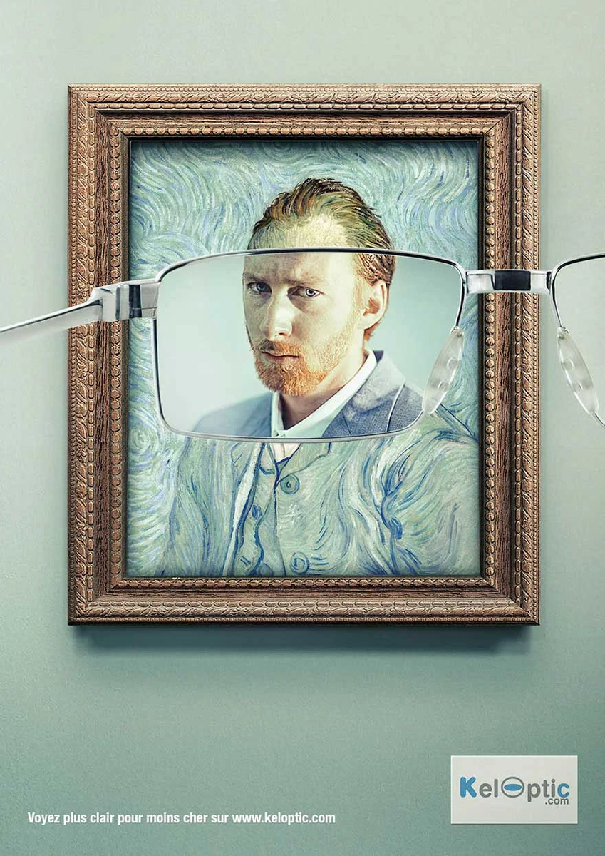 Keloptic, интернет-магазин, продающий очки и солнцезащитные очки по рецепту, недавно запустил гениальную печатную рекламную кампанию, которая привлекла широкое внимание. На первый взгляд, реклама просто показывала размытое, нечеткое изображение знаменитого постимпрессионистского автопортрета Винсента Ван Гога. Лицо художника было почти невозможным, теряющимся в водоворотах неприметных цветов и форм.