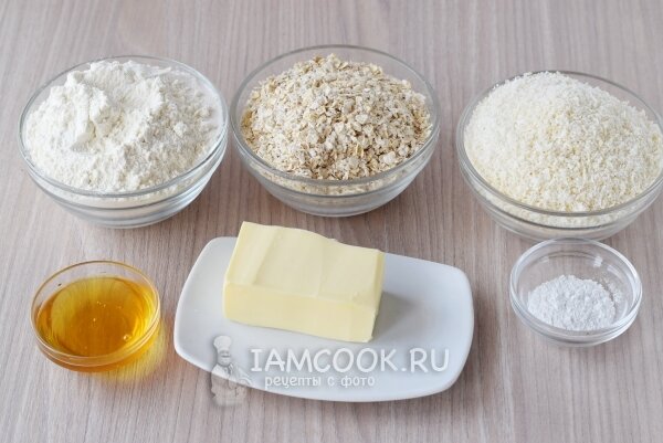 Ингредиенты Мука пшеничная - 100 г Овсяные хлопья - 100 г Кокосовая стружка - 65 г Сахар - 100 г Мед - 1 ст.л. Сливочное масло - 100 г Сода - 1,5 ч.л. Вода - 2 ст.л. Процесс приготовления История этого популярного хрустящего печенья связана с Первой Мировой войной, когда австралийские женщины, желая порадовать своих мужей-воинов и проявить свою к ним любовь, готовили печенье Анзак и посылали посылки с этим ароматным печеньем на фронт. К счастью, печенье не твердело, а становилось хрустящим, поэтому было очень отличным лакомством. Если говорить об этом печенье с позиции сегодняшнего дня, то оно очень похоже на овсяное печенье, единственным дополнением в рецепте печенья Анзак является наличие коксовой стружки. Итак, подготовим все необходимые ингредиенты для печенья Анзак. В миске смешаем сухие ингредиенты: муку, овсяные хлопья, кокосовую стружку. Добавим сахар и разрыхлитель для теста. Хорошо перемешаем все сухие ингредиенты. Сливочное масло и мед растопим в микроволновой печи и вольем