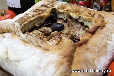 Есть немало рецептов приготовления курицы запеченной в тесте. Это не совсем то, что я хочу предложить Вам сегодня. Здесь будет мягкая, сочная и ароматная курица именно в хлебе. Крупнопористом, с хрустящей корочкой и чуть резиновым, пропитанным куриным и оливково чесночным ароматом мякишем. И тесто для хлеба и саму курочку лучше подготовить с вечера на ночь. При этом отдельной строкой замечу, что даже если Вы готовить тесто для хлеба будете впервые, Вы будете изрядно удивлены, насколько это будет быстро и просто. Вы не то, что испугаться не успеете... даже руки не запачкаете. Для рецепта потребуется: 320г белой пшеничной муки 259мл воды чайная ложка сухих дрожжей чайная ложка соли Для начинки: 1кг курицы столовая ложка мёда 3 столовые ложки соевого соуса соль, чёрный перец, сушёный чеснок, паприка половина лимона 5-6 зубчиков чеснока по горсти оливок чёрных и зелёных Тесто, с которого мы и начнем приготовление этого блюда, у меня рассчитано на форму 20 на 20. Если она у Вас больше,