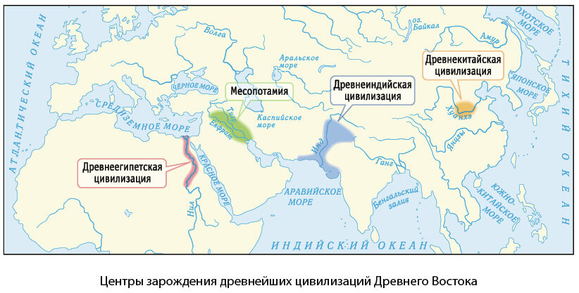 Понятие «Древний Восток» не географическое, а историко-культурное, цивилизационное. Оно включает такие государства, как Древний Египет, Древнюю Месопотамию, Древний Китай и Древнюю Индию. Основные центры этих древневосточных цивилизаций сложились в долинах рек Нила, Евфрата и Тигра, Инда и Ганга, Хуанхэ в 4-3 тыс. до н.э. Именно здесь сложились благоприятные условия для появления первых государств, так как в первую очередь этому способствовала оптимальная экологическая среда. В долинах рек образовывались районы с плодородной почвой. Древние роды людей стали объединяться, чтобы осваивать эти земли. Они создали единую ирригационную систему, чтобы орошать почву и земледелие было продуктивным. Необходимость коллективного освоения земель во многом предопределила не только формы хозяйственной деятельности, но и политической. Таким образом, древневосточная родоплеменная организация трансформируется в протогосударство (начальная форма государства, его зарождение). Протогосударства Древнег