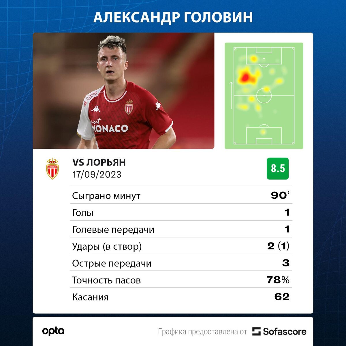 Российский полузащитник «Монако» Александр Головин забил гол в гостевом матче пятого тура чемпионата Франции против «Лорьяна». Футболист сборной России отличился на 17-й минуте, сравняв счет. К концу первого тайма счет в матче 1:1. Встреча в итоге завершилась со счетом 2:2, россиянин также отметился первой в сезоне голевой передачей. Головин забил уже во второй встрече за «Монако» подряд. В предыдущем туре он поразил ворота «Ланса» (3:0). Всего 27-летний полузащитник проводит свой пятый матч за «Монако» в нынешнем сезоне. Это его второй гол. Головин перешел в «Монако» в 2018 году из московского ЦСКА за $35,8 млн. Его нынешнее соглашение рассчитано до лета 2026 года. Букмекерская компания «Фонбет» принимает ставки на победу «Монако» в этом матче с коэффициентом 1,92, на победу «Лорьяна» — 5,10, на ничью — 2,95. Sofascore