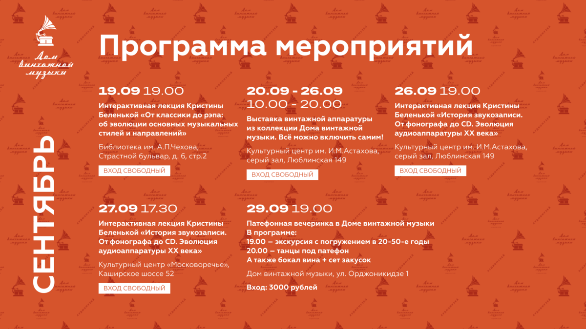 Друзья, публикуем программу мероприятий на ближайшие две недели! 📻19 сентября в 19.00 в библиотеке им. А.П.Чехова на Страстном бульваре интерактивная лекция "От классики до рэпа: об эволюции основных музыкальных стилей и направлений". 📻С 20 по 26 сентября в культурном центре им. И.М.Астахова пройдет выставка винтажной аппаратуры из нашей коллекции. Всё можно будет потрогать и включить самим! А 26 сентября в 19.00 в рамках выставки пройдет лекция об истории звукозаписи. 📻27 сентября в 17.30 встречаемся в культурном центре "Московоречье" на лекции Кристины Беленькой "История звукозаписи. От фонографа до CD" 📻29 сентября в 19.00 ждем всех в Доме винтажной музыки на Патефонной вечеринке от Ильи Рыболовецкого. В программе: экскурсия, танцы под патефон, а также бокал вина и сет закусок. Купить билет по ссылке До встречи на мероприятиях! #домвинтажноймузыки #события #мероприятия #бесплатновмоскве #лекции #кудапойтивмоскве