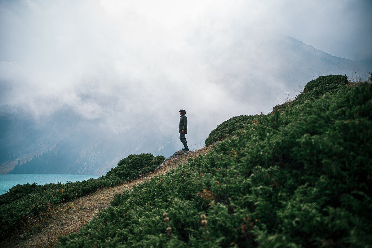 Во-первых, так дешевле. Во-вторых, интереснее - это возможность познакомиться и пообщаться с новыми людьми. Как вы понимаете, для меня знакомства - одно из самых важных занятий, друзей то в новом городе у меня нет. Вдобавок, случайные попутчики всегда рассказывают занимательные истории, а я рассказываю в свои.. Половину пути я проехал с молодым мужчиной по имени Кадыр - оригинальный товарищ, рассказывал мне, как попал в места не столь отдалённые за то, что подрался с начальником)) Но при этом добрейшей души человек!) Другую половину с семейной парой. Супруги поделились историей о том, как первый раз понимались в горы пешком и устали настолько, что больше так делать здесь не планируют) Более 4 часов у них занял только спуск с горы!!!! Такой вот маршрут с пересадками)) После приезда мы разделились, я пошёл гулять и снимать свой влог) Уже через 10 минут ясная погода на вершине сменилась густым туманом. Внезапно я увидел мужчину в зелёной куртке - и это был звёздный час моего внутреннего t