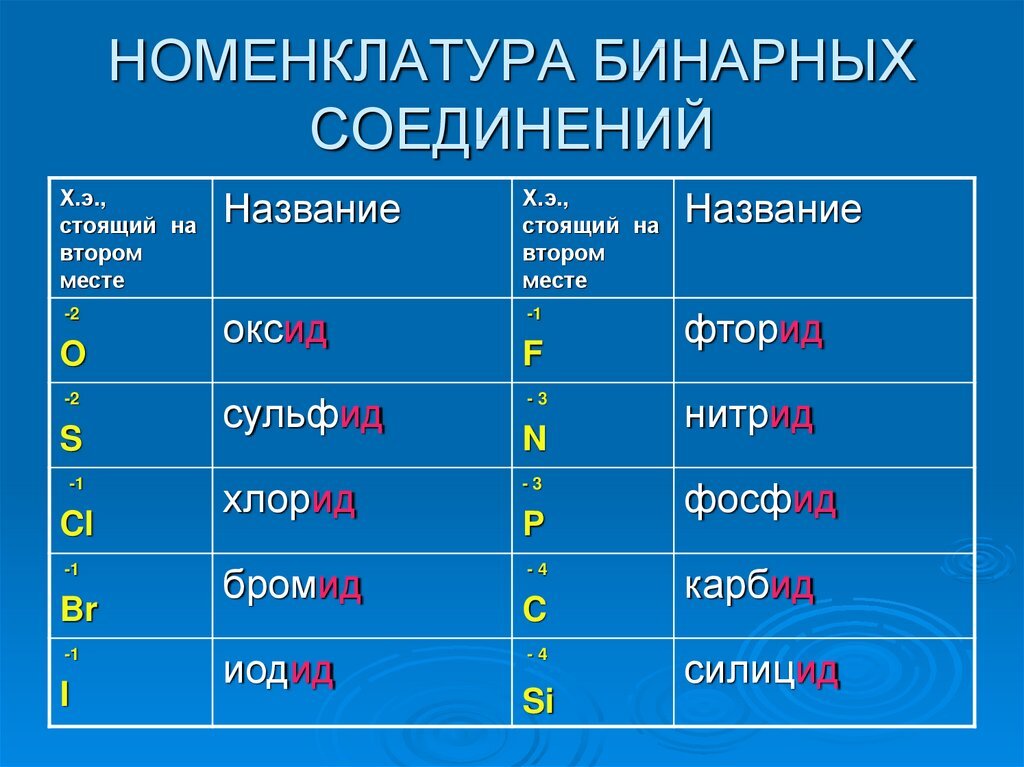 Названия одноатомных анионов Когда мы называем анионы мы добавляем в конец суффикс -ид Как узнать степень окисления по таблице Мы уже обсуждали в прошлых статьях, что номер группы (вертикальные столбцы) показывает заряд атома и количество электронов на внешнем уровне. Но не у всех элементов точно определенное число электронов на внешних уровнях. Например с 3 по 12 группу степени окисления могут быть совершенно разные. Но мы точно знаем знаем, что 1, 2 и 13 группы в большинстве образуют катионы (положительно заряженные атомы), в группе 14 элементы чаще всего образуют 4+ заряды, но могут и 4- в конкретных случаях, а с 5 по 17 образуются анионы (негативно заряженные атомы). Нахождение химической формулы по названию Пример 1: Хлорид калия. В формуле фигурируют хлорид(Cl) и калий(К), смотрим по таблице и окончанию -ид на их заряды. Вспоминаем, что катионы всегда пишутся первые, значит калий будет стоять впереди - KCl Пример 2: Как называется ионное соединение Mg3P2. По периодической таблице