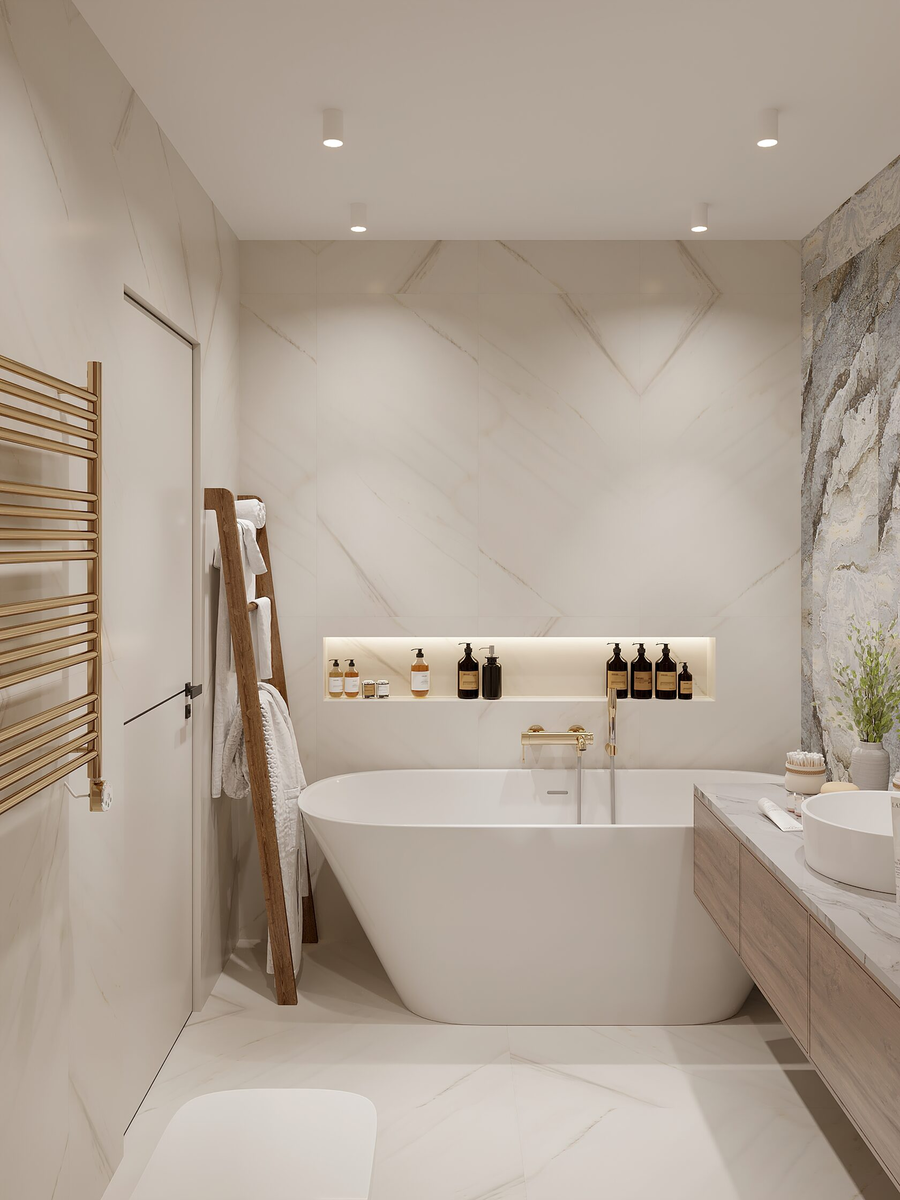 В этой статье мы рассмотрим рабочие моменты дизайна интерьера ванной комнаты — конкретные технологии, идеи и материалы, которые делают ее по-настоящему практичной и современной. Подвесной унитаз со встроенной инсталляцией Подвесной унитаз решает сразу несколько проблем домовладельца. Во-первых, это супер-облегченная уборка. И корпус, и пространство под ним, и отсутствие бачка — все это упрощает наведение порядка. Далее идет лаконичность образа. Здесь в ход идут минималистичные простые линии, которые, несомненно, отлично смотрятся в маленьком пространстве типа ванной комнаты. Но важно отметить еще и факт наличия ниши. После установки гипсокартонной перегородки (15–25