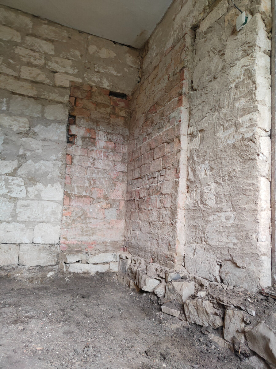 Это уже становится традицией, усложнить себе работу на ровном месте. С другой стороны я бы так конечно не изгалялся, если бы стены были более менее ровные, но в нашем случае это оправдано. Если бы я не делал этого, то слои штукатурки были бы гораздо больше. По этому приходится стёсывать выступающие области максимально, где это только возможно. Вот и сегодня очередная разметка не стала исключением. Только особенность её в том, что пришлось это делать на печной стене. А этот кирпич очень плотный, его просто так не взять. Стена эта выглядит вот так. Часть стены обычная и часть печная. В начале нашёл "ноль" на печной стене (на той что без выступа) и продолжил разметку остальной стены. Слой получился довольно внушительный, в самом широком месте до 5 см., по этому стал опять прикидывать где можно выкроить. На обычной стене процедура стандартная, утопил насколько возможно, стесал выступающие области, а вот с печной сложнее, там перфоратором не получится, вдруг развалится всё от вибрации, ст