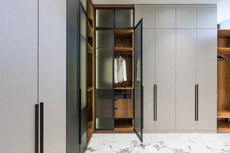 Один из ключевых моментов в управлении гардеробной комнатой - это упорядочить все вещи таким образом, чтобы они были видны и легко доступны. ❕Разместите штанги и полки на уровнях, где вы можете легко достать нужную вещь.