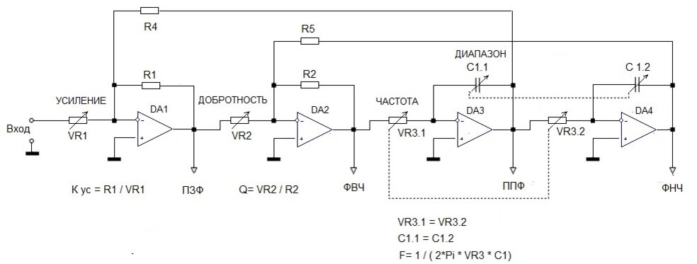 Предназначен для исследования характеристик УНЧ, устройств связи и устройств управления. Может использоваться в составе действующей аппаратуры. Например: -для измерения уровня собственных шумов в заданном диапазоне частот; -для измерения уровня помех в заданном диапазоне частот; -для оценки уровня сигналов команд в речевом канале; -для оценки необходимых параметров фильтров в составе аппаратуры и пр. Универсальный фильтр представляет собой двухполюсный активный фильтр второго порядка, построенный на четырех операционных усилителях по структурной схеме рис.1: Рис.1.Структурная схема универсального фильтра Каждое звено обеспечивает различные особенности фильтра: В самом фильтре можно напрямую настроить параметры: частоту среза, центральную частоту, добротность, общее усиление. Схема электрическая фильтра приведена на рис.2: Рис.2. Схема электрическая Схема выполнена на малошумящих, обеспечивающих низкие искажения ОУ типа OPA2134. Для меньших требований тоже подойдут TL072 или NE5532. Ра