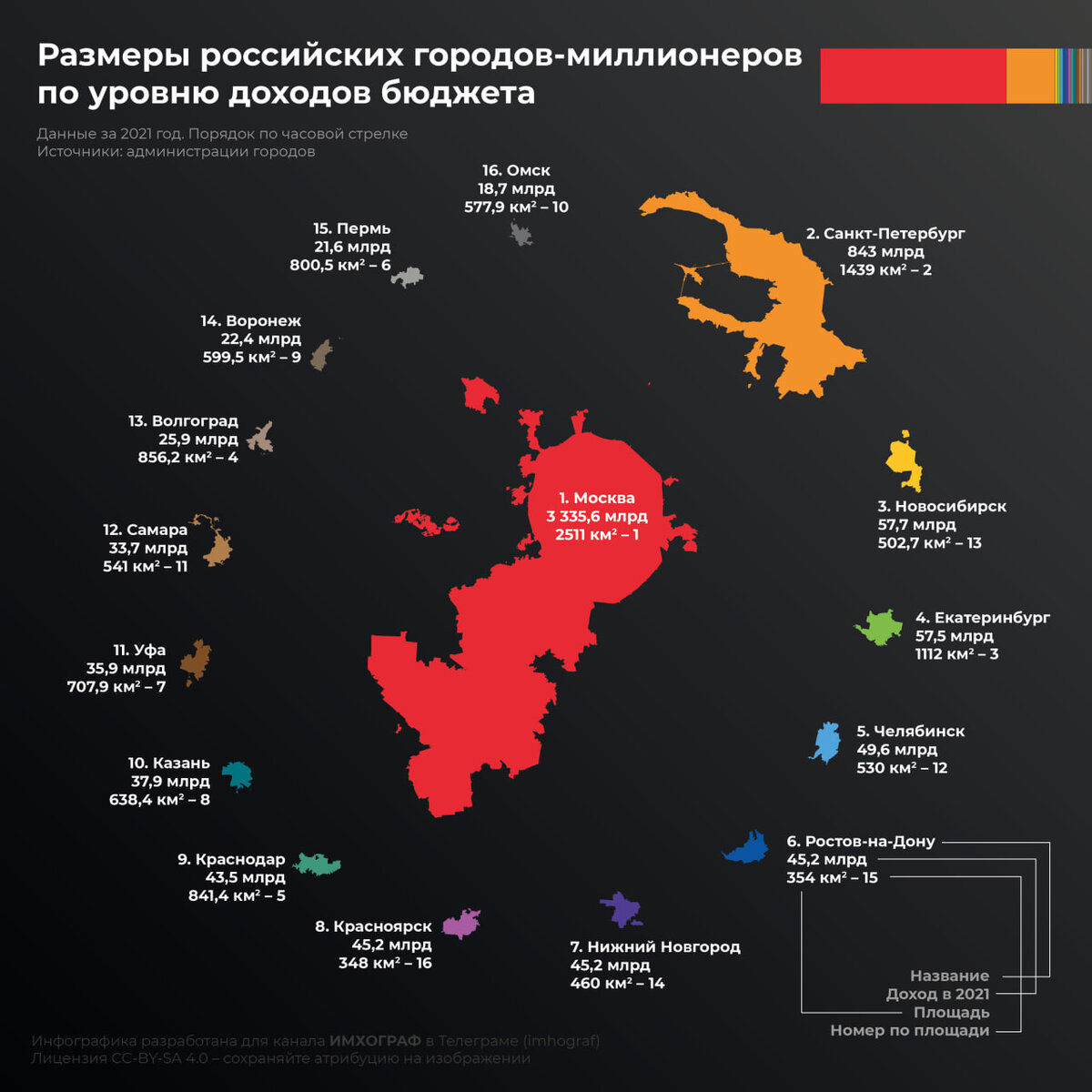 Для меня не было сюрпризом, что Москва по уровню доходов в разы превышает все остальные города-миллионеры вместе взятые. Если быть точнее, то более чем в 2 раза. А без учета Санкт-Петербурга — более чем в 6 раз! Разрыв в доходах колоссальный. Он обусловлен особым положением Москвы в иерархии регионов России, ее населением и, конечно, площадью. Например, по населению Москва более чем в 2 раза превышает Санкт-Петербург, а по площади — более чем в полтора раза. При этом сам Санкт-Петербург по доходам превышает третий город-миллионер — Новосибирск — более чем в 14 раз. Доходы Новосибирска составили в 2021 году 57,7 млрд рублей, на 4 месте расположился Екатеринбург с 57,5 млрд рублей. Далее на 5 месте, внезапно, Челябинск с 49,6 млрд рублей, Ростов-на-Дону, Нижний Новгород и Красноярск — 6, 7 и 8 места с почти одинаковым уровнем доходов в 45,2 млрд рублей. Что меня удивило — Казань занимает аж 10 место с 37,9 млрд. Воронеж скромно уместился на 14 позиции с 22,4 млрд. А бюджет Краснодара м