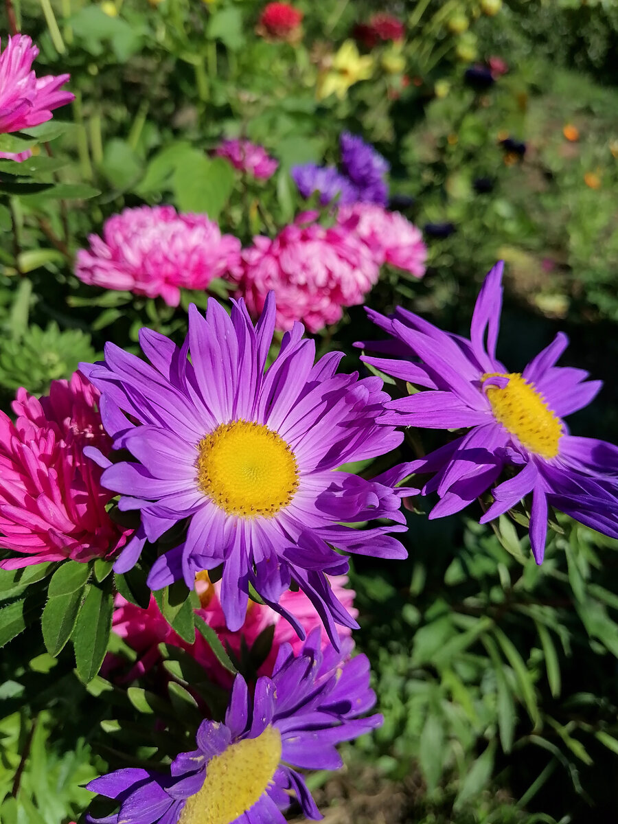 Весной купила несколько пакетиков китайской астры. Сначала посеяла дома. Они дружно взошли, потом дружно погибли. Так повторилось пару раз. Тогда, в апреле я высеяла из прямо в грунт в нескольких местах , в контейнеры, в теплицу. И ещё в одну открытую теплицу. Опять все взошли. И на этот раз выжили . Думала , то будут небольшие бордюрные астры. А они вымахали огромные. Впрочем , как и все остальные цветы этого лета. И георгина, и цинии, и флоксы... все дылды.