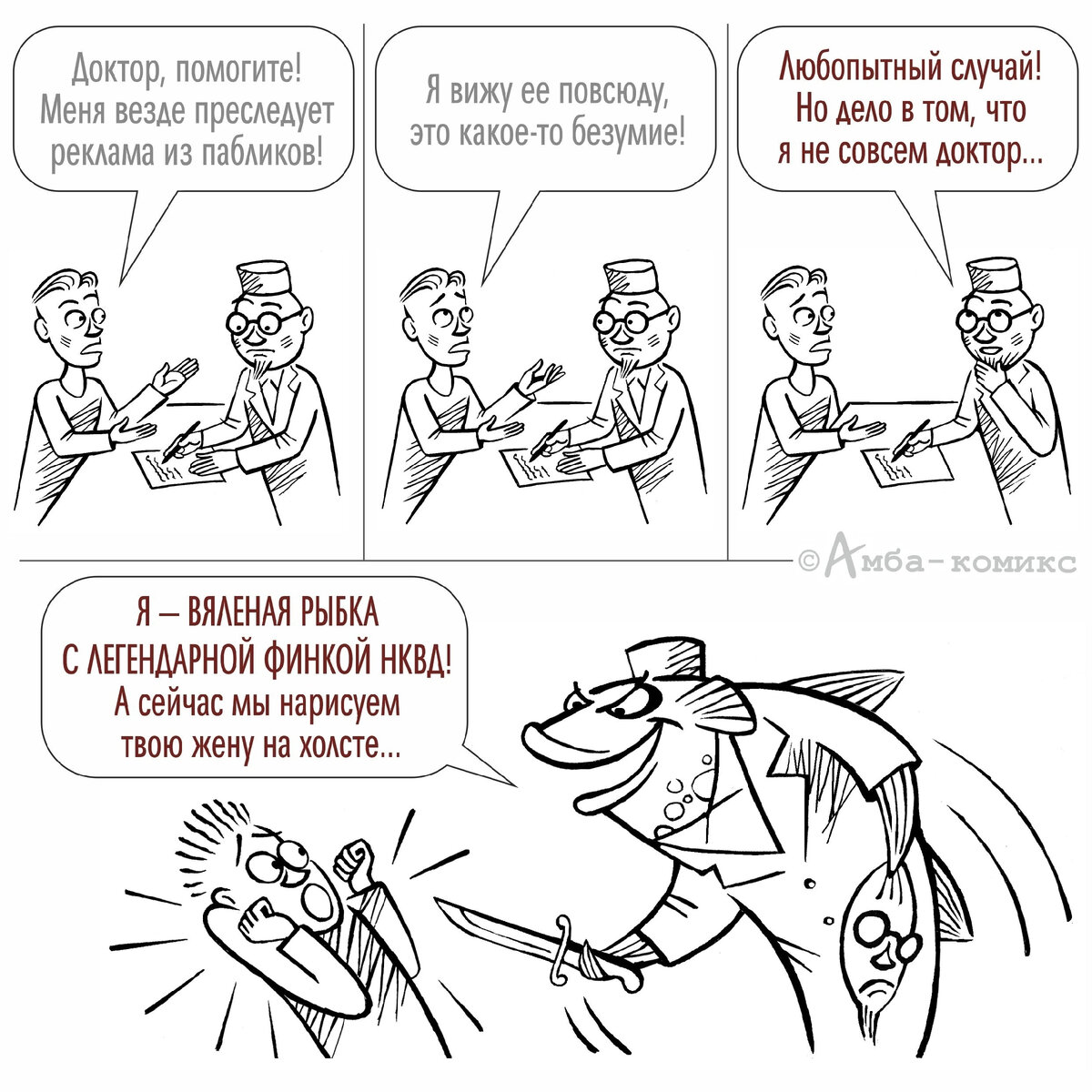 Реклама - двигатель торговли и, само собой, всем понятно, что если о товаре никто не знает, то и покупать его никто не будет. Так что, как бы нам не хотелось, в современном мире избежать рекламы бывает очень сложно: сейчас она везде - в телевизоре, на радио, в интернете, на билбордах, да даже в наших почтовых ящиках. Конечно, есть способы уменьшить количество рекламы в своей жизни - к примеру, ставить блокировщики у себя в браузере, но совсем ее избежать вряд ли получится. И сегодняшняя подборка комиксов как раз про это - про назойливую рекламу, от которой очень сложно спрятаться. Надеюсь, что эти зарисовки вас повеселят! Герой одного из комиксов екатеринбургского художника Павла Югринова - создателя серии Амба-комикс - настолько устал от рекламы, что даже решил обратиться к врачу с этой проблемой. Но сможет ли врач с этим помочь? А выпуск серии комиксов под названием Buni («Бани») от американского художника Райана Пагелова (Ryan Pagelow) посвящен той самой всплывающей рекламе в интерн