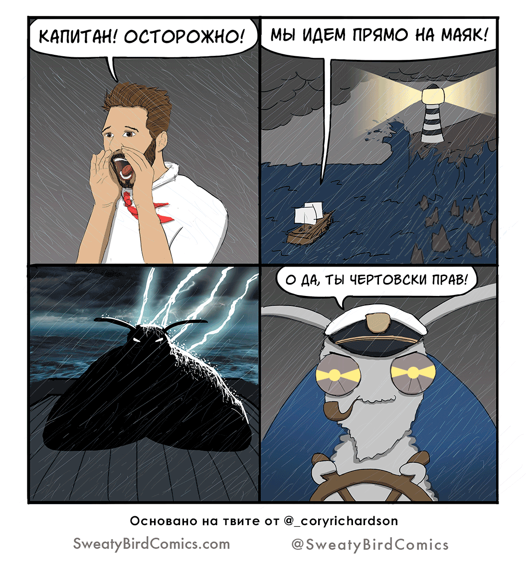 Если вы всегда мечтали уехать подальше от мирской суеты и поселиться на каком-нибудь уединенном маяке, то сегодняшняя подборка для вас. Ну, или для тех, кому просто нравится морская тематика. Как оказалось, в сети уже довольно много художников успели пошутить про маяки, так что у меня накопилось достаточно комиксов для целой статьи. Их я и хочу показать вам сегодня. Надеюсь, что эти зарисовки вам понравятся! Один из выпусков серии комиксов Sweaty Bird («Потная птица») в какой-то момент стал очень популярен в сети: на него можно было наткнуться на множестве развлекательных ресурсов. А все благодаря абсурдной, но очень смешной концовке. То, что именно этот выпуск серии комиксов Twonks («Дураки») английского сценариста и иллюстратора Стива Нельсона (Steve Nelson) попал в данную подборку - это уже небольшой спойлер, но, будем надеяться, этот сюжет все равно вас повеселит. Раз уж речь уже зашла о смотрителях маяков, ниже будет еще парочка комиксов на эту тему. Художница Валерия Амелина - со