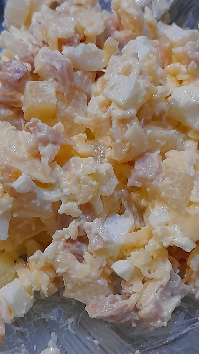 Оригинальный салатик с пикантным вкусом. Сытный, нежный, ароматный, сладковатый. Можно подавать в тарталетках, на брускетте. Быстро и просто. Всего ПЯТЬ ингредиентов: Копченая курица (окорочка) — 2 шт.; Нарезка кубиком всех ингредиентов, кроме сыра, его на крупной терке Ананасы консервированные — 370 гр. (масса нетто основного продукта в банке).; Яйца — 6 шт.; Сыр (можно Российский)— 200 гр.; Перемешать, но не стоит заправлять сразу весь салат, лучше сделать это перед подачей к столу. Майонез по вкусу. По желанию можно добавить кукурузу или сельдерей, зелень. Всем, всем приятного аппетита. Создавайте свои вкусовые шедевры, творите, живите ярко и вкусно КАЖДЫЙ ДЕНЬ. Смотри так же: Фунчоза с курицей и овощами