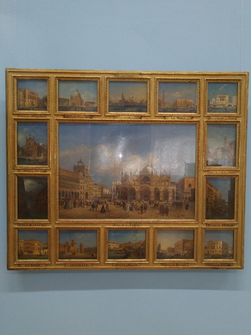 «Виды Венеции» — не единое полотно, каждое изображение написано на отдельной деревянной панели, все они собраны в единой раме. Сын гравировальщика на меди литограф Виктор Адам с миниатюрной точностью передал все детали архитектурных памятников Венеции, продолжая лучшие традиции венецианской школы ведутистов XѴIII века. Возможно, такое необычн