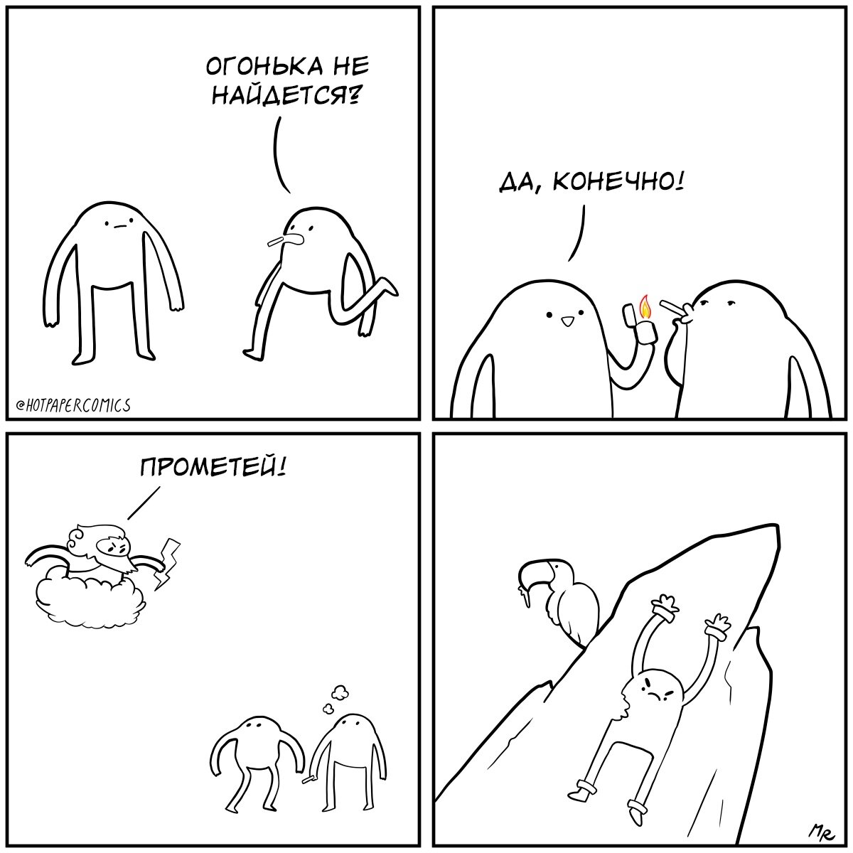 Древнегреческая мифология продолжает быть очень популярной даже спустя тысячи лет - к ней отсылаются фильмы, видеоигры и, конечно же, комиксы. Думаю, во многом такая популярность обусловлена тем, что в мифах древних греков есть целый набор харизматичных и запоминающихся персонажей, будь то герои, боги или жуткие монстры. Плюс ко всему, у многих из этих персонажей есть и свои запоминающиеся особенности - например, Горгона превращает людей в камень, а Прометей известен тем, что подарил людям огонь. И когда такой материал попадает в руки к комиксистам, все это превращается в отличные заходы для шуток. Хорошее тому доказательство - комиксы, которые я сегодня для вас отобрал. Надеюсь, что они вам понравятся! Хорватский художник Мартин Роснер (Martin Rosner) - автор серии Hot Paper («Горячая бумага») - помимо создания комиксов также занимается стендапом. Так что с чувством юмора у него точно все отлично. И первый комикс в этой подборке это только подтверждает. Еще один комикс про Прометея на