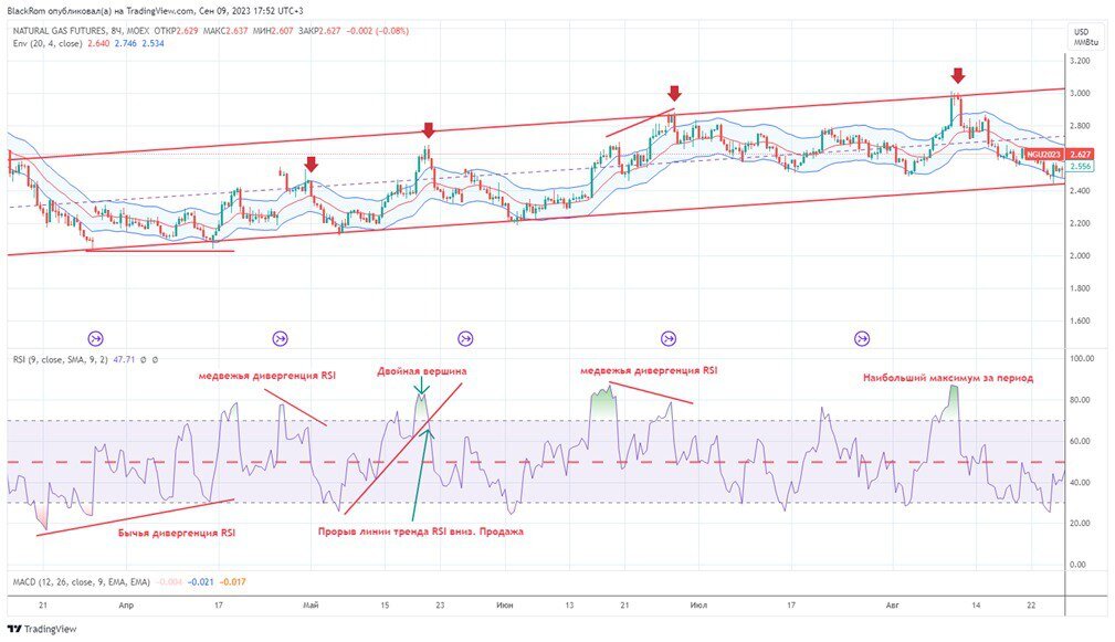 Сигналы RSI по убыванию их важности 1. Дивергенция: a) Бычья дивергенция. Если цены падают до нового минимума, а RSI дает более высокий минимум, чем при предыдущем падении цен - Покупайте, как только RSI двинется вверх из второго минимума и поместите стоп-заявку ниже последнего локального минимума цен. Сигнал к покупке особенно силен, если первый минимум лежит ниже критического уровня, а второй выше него. b) Медвежья дивергенция. Если цены поднимаются до нового максимума, а RSI дает более низкий максимум, чем при предыдущем подъеме цен - Продавайте, как только RSI двинется вниз из второго максимума и поместите стоп-заявку выше последнего локального максимума цен. Сигнал к продаже особенно силен, если первый максимум лежит выше критического уровня, а второй ниже него. Двойная или тройная дивергенция состоит из 2х или 3х минимумов или максимумов цен и 2х или 3х минимумов или максимумов осциллятора. Она еще важнее, чем обычные дивергенции. 2. Линии тренда, поддержка и сопротивление, "голо