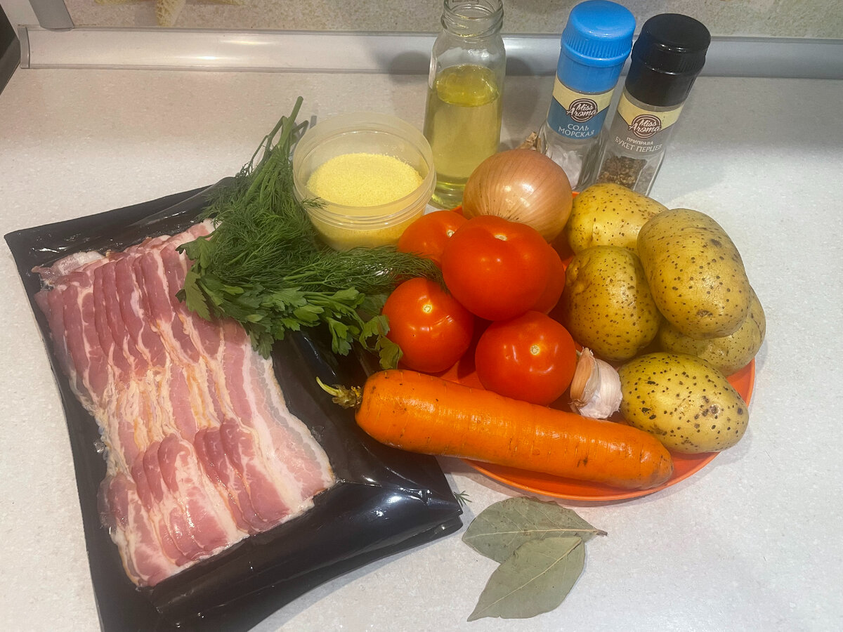 Такой супчик понравится и взрослым, и детям. Готовится он очень просто и не отнимет у вас много времени. Побежали на кухню. Список продуктов для супа: 1. Чеснок, морковь, лук и картофель помыла и почистила. 2. Бекон нарезала кусочками. 3. Морковь натерла на крупной терке, лук нарезала мелкими кубиками, а картофель - небольшими кусочками. 4. Взяла кастрюлю, в которой буду готовить суп, влила растительное масло и разогрела его. Обжарила бекон, постоянно помешивая. 5. Затем вынула его из кастрюли и пока отложила в сторону. 6. Выложила лук и морковь, обжарила до золотистого цвета. 7. Отправила к овощам кускус и картофель, перемешала. 8. Залила все содержимое кастрюли водой, посолила, довела до кипения и готовила 15 минут. 9. Помидоры помыла и нарезала небольшими кусочками. Измельчила чеснок. Всю зелень помыла и мелко порубила. 10. Чеснок и помидоры выложила в суп. 11. Немного бекона оставила для подачи, а остальной закинула в кастрюлю. 12. Дала супу покипеть еще 5 минут. Добав