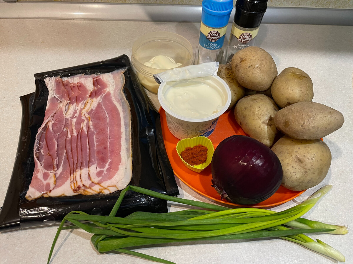Может вид у этого салата не очень аккуратный, но на вкус он просто восхитительный. Бекон и картофель делают салат питательным, а зеленый и красный лук придают ему свежести. В этом салате вам понравится все - и аромат, и вкус и состав продуктов. Приступим. Что я взяла для салата: 1. Картофель хорошо помыла, выложила в кастрюлю, залила холодной водой и отварила до готовности. Затем полностью остудила. 2. Луковицу почистила, помыла и нарезала полукольцами. 3. Разогрела сковороду. Не добавляя в нее масло, выложила полоски бекона и обжарила с обеих сторон примерно по 1 минуте. Немного остудила. 4. Когда он остыл, нарезала небольшими кусочками. 5. Картофель почистила и нарезала небольшими кубиками. 6. Зеленый лук помыла и мелко нарезала. 7. В миску выложила зеленый лук, бекон, красный лук и картофель. 8. Добавила соль, перец, паприку, сметану и майонез. 9. Хорошо перемешала все ингредиенты. Аппетитный картофельный салат с луком и беконом готов. Его можно подать к основному блюду, а