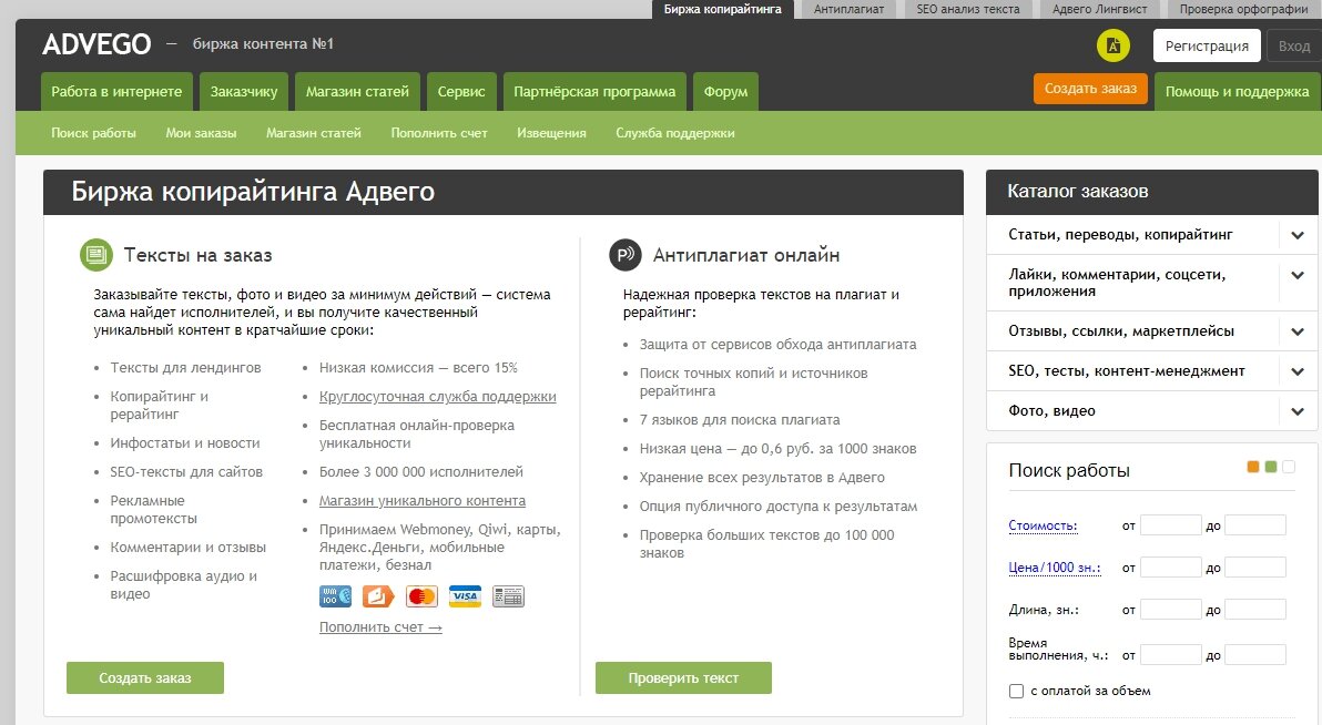 Именно с этой биржи, с которой лучше начать работу новичкам. Первоначальные расценки невысокие. За 1000 символов можно заработать 20-100 руб. Необходимо зарегистрироваться, найти подходящие заказы и подать заявки. Если заказчик выберет исполнителя, получится выполнить работу. Вывести средства можно на Вебмани, Киви и ЮМани. Доступно получение денег на карту, но придётся накопить приличную сумму.