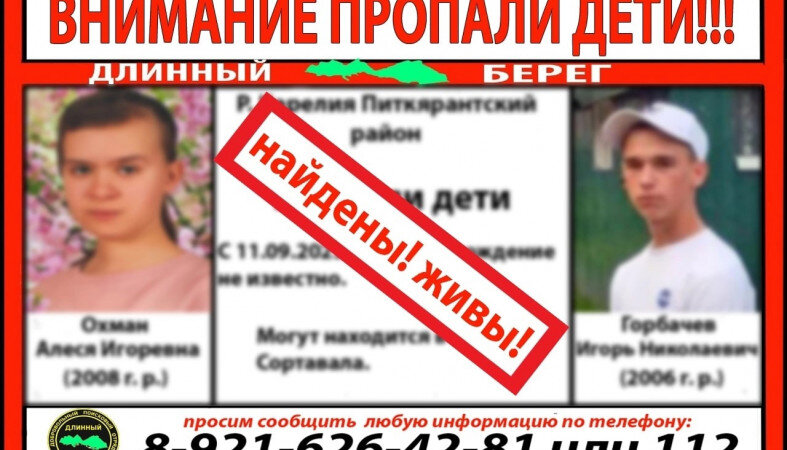 Пропавших в Питкярантском районе Карелии подростков задержала полиция. Почти неделю их искали по всей республике, они были замечены и в Петрозаводске, и на федеральной трассе. Напомним, 11 сентября пропали 15-летняя Алеся Охман и 17-летний Игорь Горбачев. Их поисками занимались правоохранительные органы и добровольный поисковый отряд «Длинный берег». Пока велись поиски, в социальных сетях Питкярантского района распространялись такие объявления: "Уважаемые владельцы дач, участков, по нашим дачам ночуют сбежавшие малолетние, накуролесившие дома дел (подозреваются в краже денежных средств), и теперь прячутся от ответственности, прошу всех проявить бдительность и проверить свои дачи, эти подростки ломают двери и вламываются в чужие жилища, ищут еду и ночлег, являюсь пострадавшей от них, полиция занимается этим вопросом, но их все еще не нашли, значит, возможно они спят на вашей даче, пока вы сидите дома". В минувшие выходные подростков задержали: сначала девочку, а на следующий день нашли