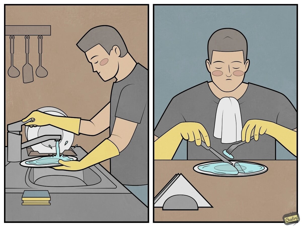 Даже если какое-либо занятие становится привычным делом, это вовсе не значит, что оно перестает утомлять. Именно поэтому так распространены шутки о том, как не хочется идти на работу, готовить или, например, мыть посуду. Кстати, именно последней теме и посвящена сегодняшняя подборка. Как оказалось, комиксов про мытье посуды в сети довольно много - оно и не удивительно: всем нам приходится сталкиваться с этим занятием, а зарисовки на жизненные темы - это как раз самый распространенный жанр веб-комиксов. В общем, сегодня я собрал для вас несколько забавных комиксов и о тех, кто нормально относится к мытью посуды, и о тех, кто очень не любит это дело. Надеюсь, что эти сюжеты вам понравятся! Популярный российский художник Gudim. в своих комиксах почти не использует слов. Этот автор больше предпочитает визуальный юмор - когда привычные образы в конце оборачиваются чем-то совершенно неожиданным. Даже если речь идет о таком обычном деле, как мытье посуды. Американская художница Сары Андерсен