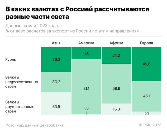 Б. Рубль опережает доллар, евро и валюты дружественных стран в расчетах за экспорт из России в Европу и Азию — в мае 2023 года его доля составляла 49,8 и 36,3% соответственно. С Америкой и Африкой ситуация пока обратная — доля рубля там составляет 17,6 и 24,2% соответственно.
