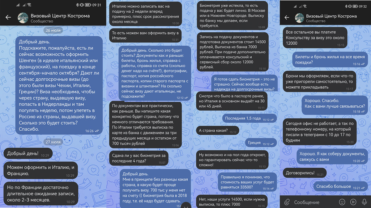 И поскольку я уже снял часть вопросов, перехожу к рассказу. Итак, получить Шенген сейчас (все меняется очень быстро) возможно в нескольких странах: Греция, Испания, Франция, Германия, Хорватия, Мальта, Норвегия, Венгрия, Португалия, Австрия, Словения, Швейцария, Швеция и Италия. Возможно, когда вы читаете этот текст, какая-то из стран уже перестала выдавать, поэтому уточняйте – информации в сети много. Сразу отбрасываем страны, где крайне сложно получить туристическую визу даже в мирное время – Мальта, Швейцария. Отбрасываем страны, которые по данным Интернета чаще всего сейчас отказывают россиянам: Норвегия, Швеция, Австрия, Венгрия, Португалия. Отбрасываем Словению и Хорватию, т.к. известно, что они только начали выдавать и большую часть выданных составляют визы только под даты поездки. Отбрасываем Германию, потому что летом это года они очень сильно ужесточили требования к финансовым гарантиям. В сухом остатке – Греция, Испания, Италия, Франция. Притом, что визы Греции, Испании и Италии я уже получал когда-то в доковидный период (о поездках в эти страны, есть тексты на моем канале). Франция и Греция отпали, т.к. многие обитатели сети жаловались на их короткосрочные визы – либо под даты поездки, либо на три месяца. Испания позже отпала по этой же причине. Осталась Италия – самая красивая страна, которую я посещал в своей жизни. Страна, которую я искренне люблю всей душой. Поэтому я стал изучать возможности подачи документов именно в консульство этой страны. Начитавшись того, что запись на подачу документов сегодня – это целый квест, я решил предоставить возможность профессионалам собрать документы за меня. Нашел в вк сообщество визового центра Костромы и написал им в личные сообщения. Переписку прилагаю.