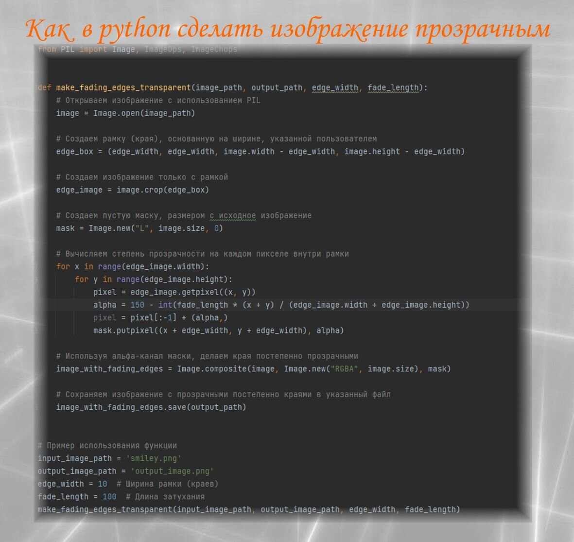 Продолжаем изучать приемы графического дизайна на python. Вот пример кода на языке Python, который позволяет загрузить изображение и сделать его прозрачным, с использованием библиотеки PIL (Python Imaging Library). В данном примере функция `make_fading_edges_transparent` принимает путь к исходному изображению, путь для сохранения прозрачного изображения, ширину рамки (краев) и длину затухания. Она использует библиотеку PIL для выполнения необходимых операций. Кстати говоря, этот код можно использовать для создания маски изображения с прозрачными краями с эффектом затухания, или разновидности виньетки. Ниже вы можете увидеть исходное изображение и то, что с ним стало. Текстовый код вы сможете скопипастить по ссылке: https://sergsergius.ru/forum/topic/%d0%ba%d0%b0%d0%ba-%d0%b2-python-%d1%81%d0%b4%d0%b5%d0%bb%d0%b0%d1%82%d1%8c-%d0%b8%d0%b7%d0%be%d0%b1%d1%80%d0%b0%d0%b6%d0%b5%d0%bd%d0%b8%d0%b5-%d0%bf%d1%80%d0%be%d0%b7%d1%80%d0%b0%d1%87%d0%bd%d1%8b/#postid-115