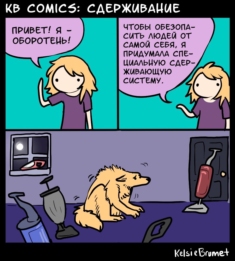 Американская художница Келси Брумет (Kelsie Brumet) - создательница серии KB Comics (название получено от инициалов художницы) - рисует минималистичные комиксы на жизненные темы. В большинстве из них главной героиней становится персонаж, срисованный с самой художницы, но бывают выпуски и на отвлеченные темы. К примеру, про оборотней.