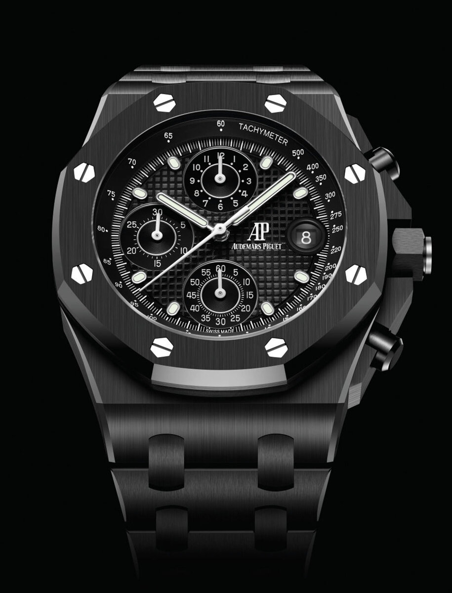 Это первая модель Royal Oak Offshore, практически полностью изготовленная из керамики. Для 42-миллиметровго корпуса, браслета, кнопок хронографа и заводной головки выбрали сдержанную черную керамику. Стрелки и винты на безеле изготовлены из белого золота. Задняя крышка титановая. Под ней скрыт механизм с автоподзаводом и 70-часовым запасом хода.
